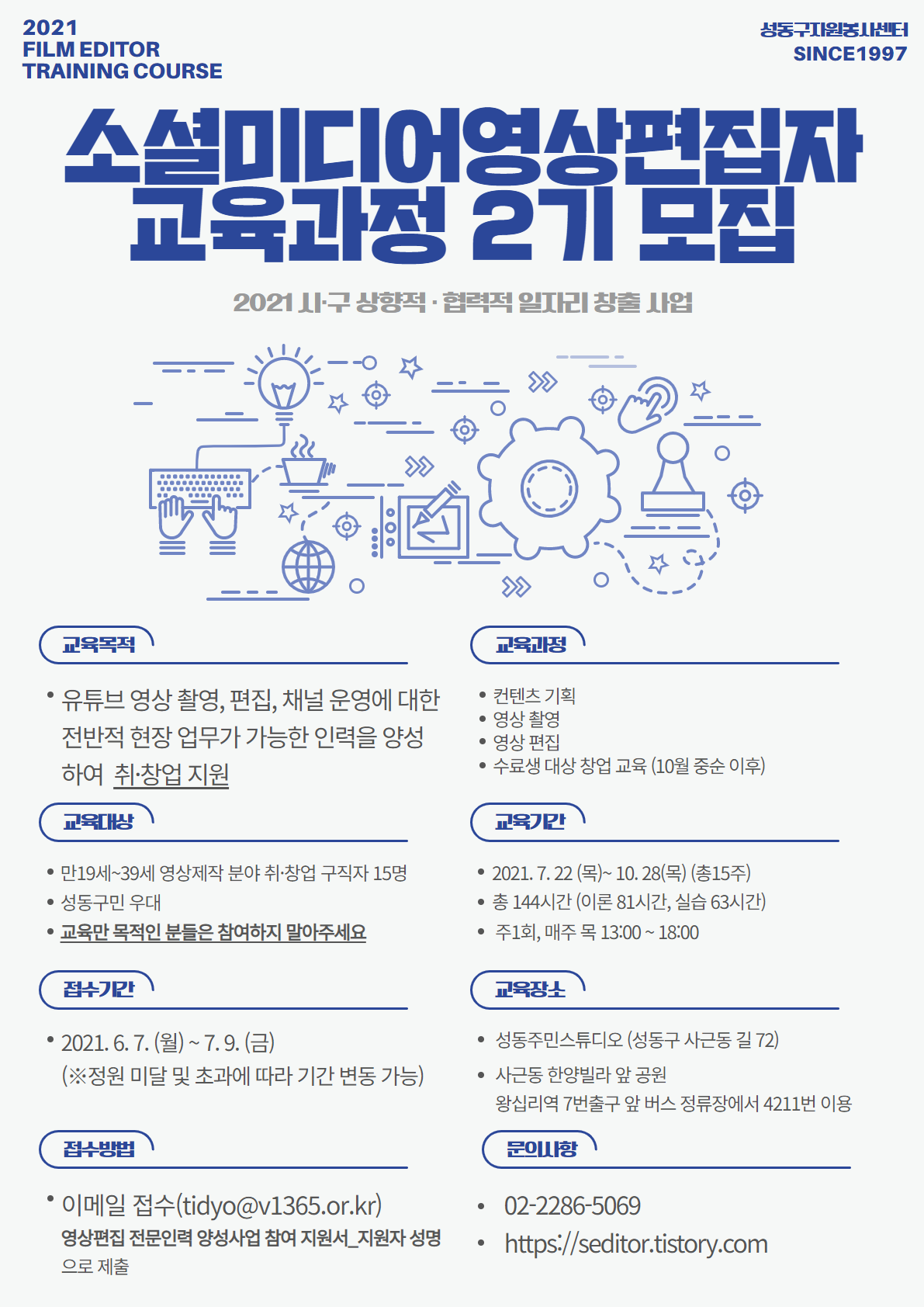 성동구에서는 기획, 촬영, 편집 등 영상 제작 업무 전반에서 활동 가능한 전문 인력을 양성하여 취·창업을 지원하는 사업에 참여할 청년을 다음과 같이 모집합니다.